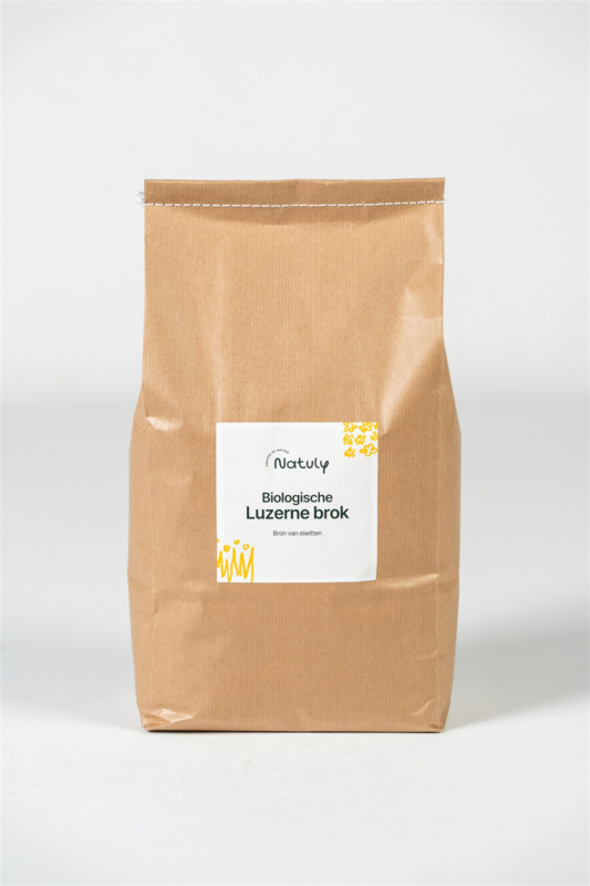 Onze luzerne brok bestaat uit fijngemalen blad en stelen/de hele plant en bevat geen toevoegingen. Met een calcium / fosfor van 5 :1 vormt het een ideale aanvulling bij het voeren van granen. Ter vervanging van een deel ruwvoer of geweekt worden tot een smakelijke slobber.